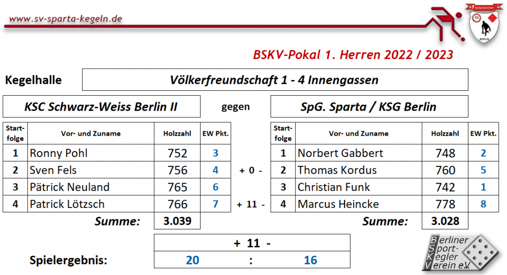 Bereits am Freitag musste man im Rückspiel des BSKV-Pokals, gegen den KSC Schwarz-Weiss Berlin, die erste Niederlage des Jahres wegstecken. In der Völkerfreundschaft verlor unsere 1. Pokalmannschaft das Spiel mit 20:16 und scheidet damit in der zweiten Runde aus.