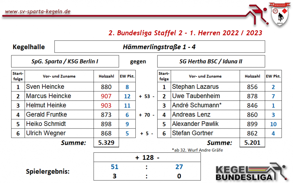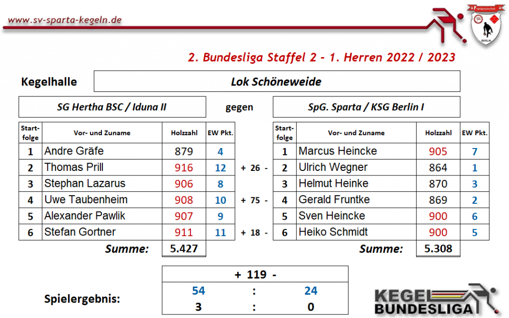 Am Samstag startete dann auch schon die Bundesliga. Im Wechselwochenende hatte man sich gegen Tabellenschlusslicht, SG Hertha BSC / Iduna II, viel vorgenommen aber gegen die Saisonbestleistung der Hertha war kein ankommen. Die 100 Holz mehr, im Vergleich zum letzten Heimwochenende, waren einfach zu stark um auch nur den Hauch einer Chance zu haben. Trotz guter Ergebnisse verloren unsere Jungs deutlich mit 3:0 tauschten damit den Platz und übernahmen die rote Laterne.
